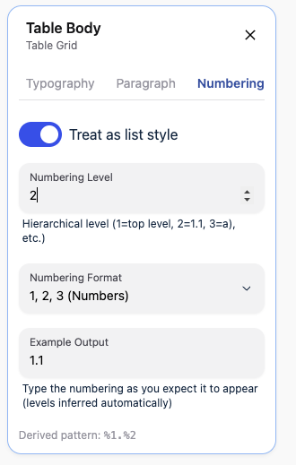 | Lists and Numbering | Formats list items and numbered paragraphs with proper numbering hierarchy. |