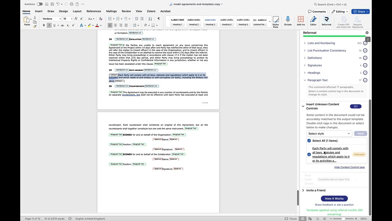 Whether you work with collaboration agreements, NDAs, or other legal documents, Reformat helps your team maintain consistent, professional formatting — saving hours of manual work.