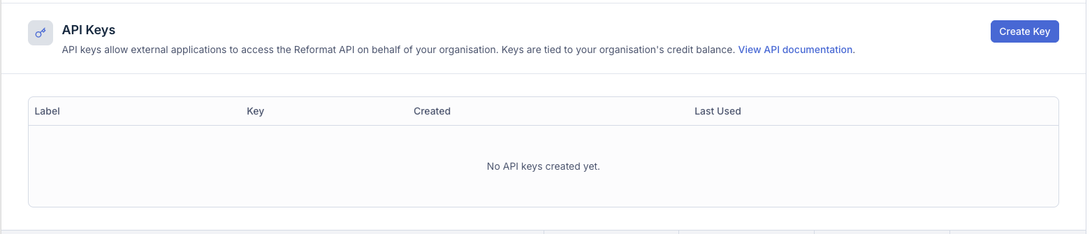 API keys let external applications access the Reformat API on behalf of your organisation. This guide covers how to create, view, and revoke keys.