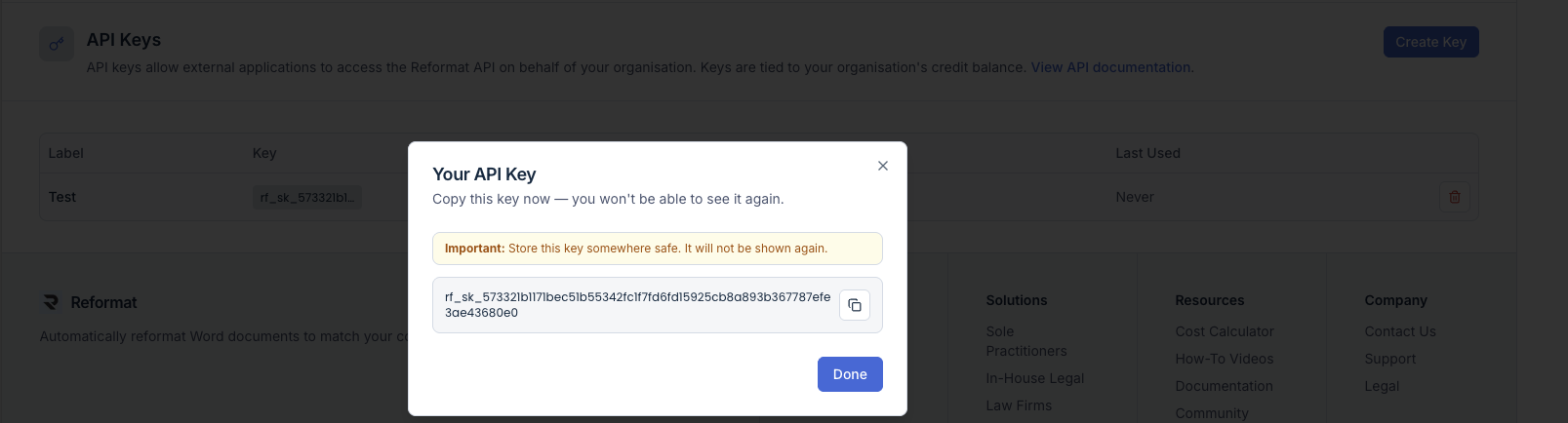 Sign in to reformatword.com and navigate to API Keys in the sidebar. The page shows all API keys for your organisation.
