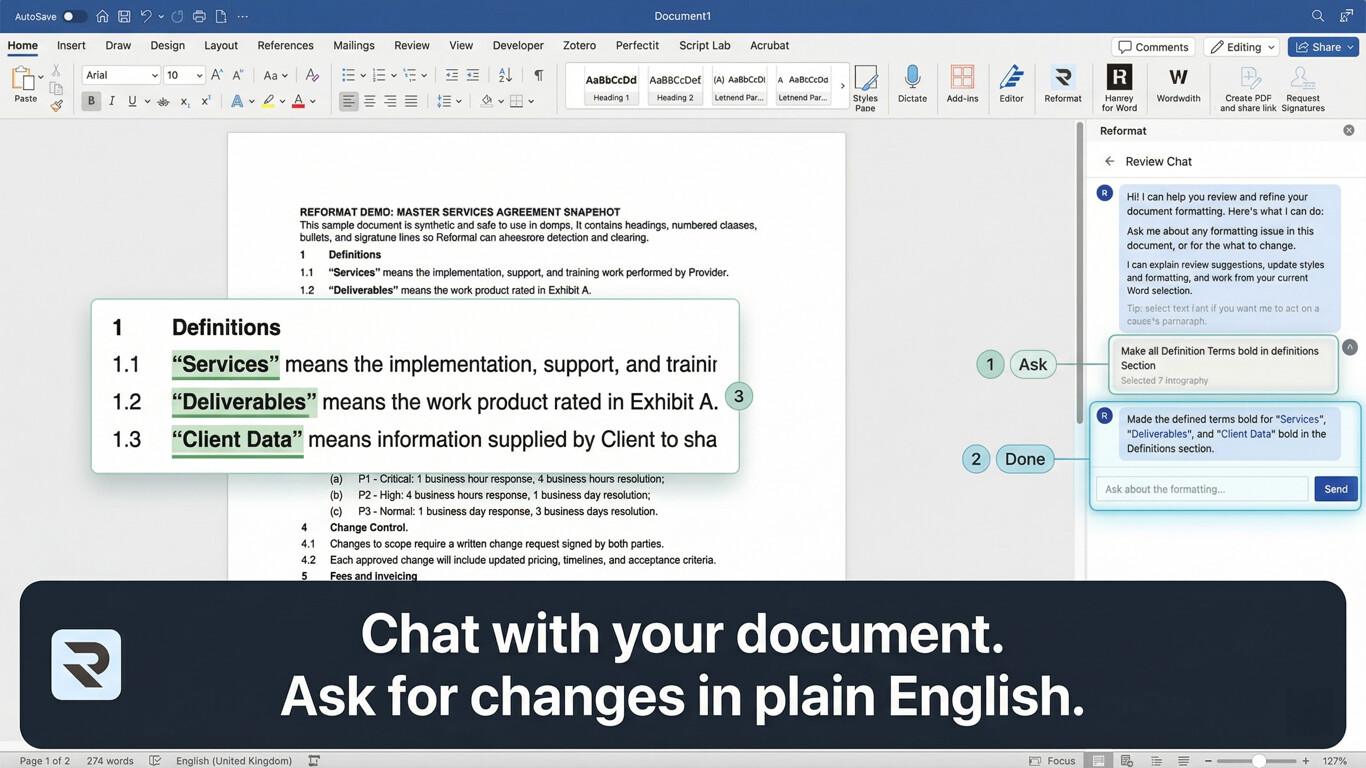 The Review Chat lets you make formatting changes to your document by describing what you want in plain English. Instead of manually finding and adjusting each paragraph, you can ask the chat to update styles, format text, adjust spacing, and more — all from within the Reformat add-in.