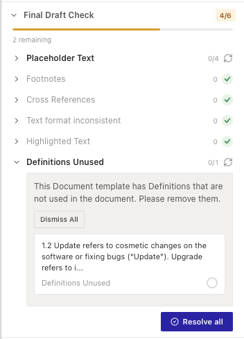 The Final Draft Check is a set of quality checks that run on your document after formatting is complete. It catches common issues like placeholder text that was never filled in, unused definitions, and style inconsistencies.